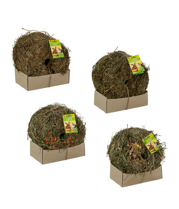 Möchten Sie Ihren Lieblingen leckeres Bergwiesenheu aus Deutschland anbieten, wissen aber nicht, welche Sorte Ihren Fellnasen schmeckt, dann erweist sich das Dehner Heuballen Probierset als optimale Wahl. Dieses vierteilige Set besteht aus dem Heuballen Pur und Heuballen, die mit Blüten, Karotten oder Löwenzahn angereichert sind. So können Sie ganz einfach ausprobieren, welche Sorte von Ihren Zwergkaninchen und Nagern favorisiert wird. Jeder Heuballen wird in einem Karton geliefert, der zu 23 % aus Gras besteht und ohne Bedenken im Gehege platziert werden kann.