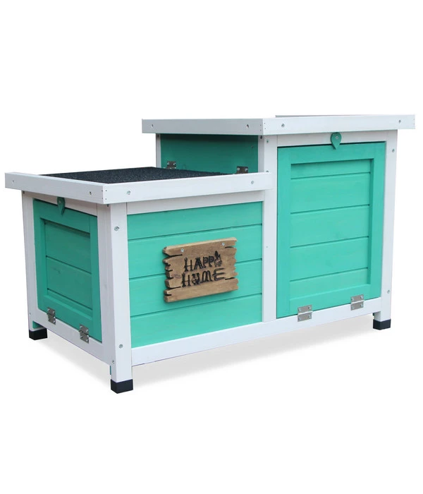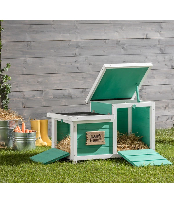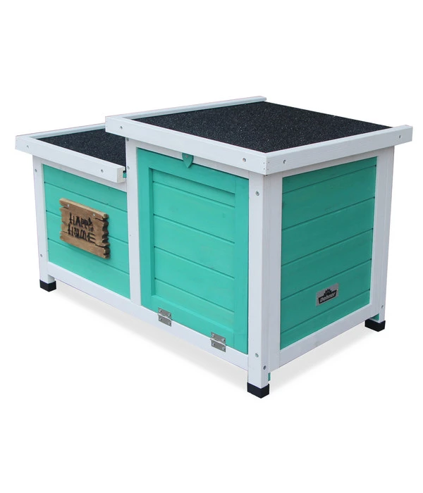 Kleintierschlafhaus, aus lackiertem Tannenholz, mit zwei als Leitern nutzbaren Türen und aufklapparen Bitumendächern