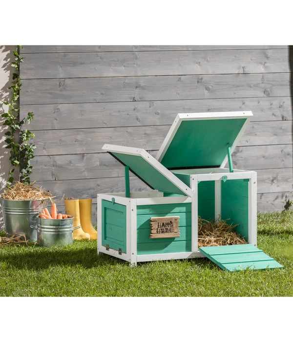 Das wasserdichte Bitumen-Dach schützt das Dehner Nagerschlafhaus Happy Home Teatro vor der Witterung und harmoniert auch optisch gut mit dem restlichen Design. Die türkise Farbe wirkt an diesem Schlafhaus besonders modern und freundlich, die weißen Rahmenlinien runden die Optik gelungen ab. Zusätzlich holen Sie sich mit dem Dehner Nagerschlafhaus Happy Home Teatro ein äußerst kompaktes Qualitätsprodukt nach Hause – bei einem gleichzeitig großen Platzangebot für Ihre Kleintiere. Sie erhalten dieses schöne Schlafhaus für Kaninchen inklusive einem praktischen Schraubensatz, der Ihnen die ohnehin schon unkomplizierte Montage erleichtern wird.