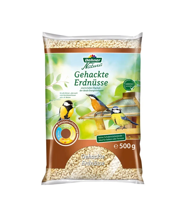 Schnabelgerechter Gourmet-Snack, den die meisten Wildvögel lieben: Dehner Natura Wildvogelfutter gehackte Erdnüsse