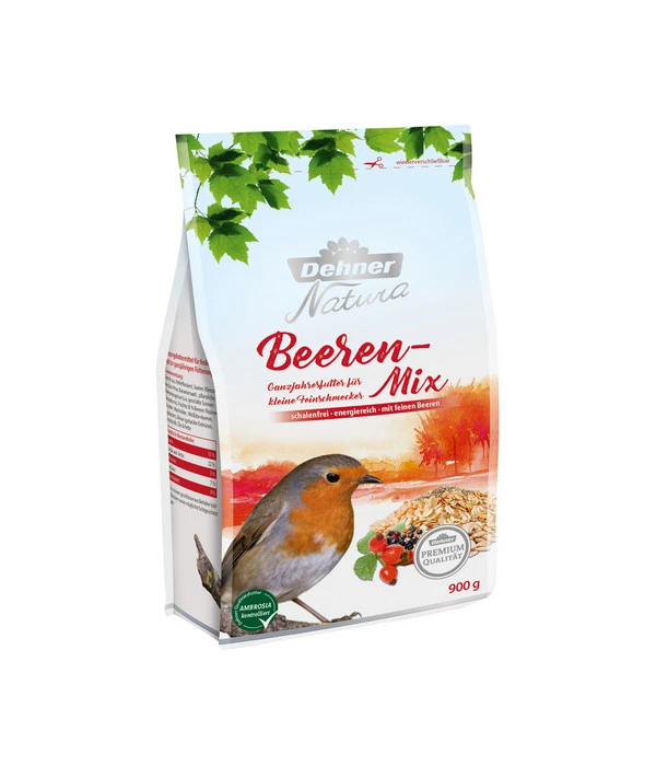 Zur Unterstützung unserer heimischen Vogelwelt wollen Sie natürlich nicht irgendwas füttern, sondern ein Vogelfutter, das auch auf die Bedürfnisse der Tiere zugeschnitten ist. Um dies zu gewährleisten, wurde der Dehner Natura Premium Beeren-Mix zusammen mit Vogelexperten entwickelt. Die hochwertige und ausgewogene Vogelfutter-Mischung besteht aus Getreide, Saaten, Früchten und Nüssen und wird in Deutschland hergestellt und verpackt. Der besondere Clou aber ist der 8%-ige Fruchtanteil aus Rosinen, Holunder-, Wacholder- und Weißdornbeeren sowie Hagebutten. Denn die Beeren schmecken nicht nur lecker, sondern liefern zudem Vitamine und wertvolle Inhaltsstoffe. Und weil der Dehner Natura Premium Beeren-Mix auch noch besonders energiereich ist, schaffen Sie mit diesem Vogelfutter von Natura Premium die Grundlage für eine gute Versorgung der Piepmätze in Ihrer Umgebung. Für Sie gut zu wissen: Der Dehner Natura Premium Beeren-Mix ist komplett schalenfrei, so dass die Wildvögel den gesamten Inhalt der Packung genießen können und Sie keinen Ärger mit lästigen Schalen auf Terrasse oder Balkon haben. Das hochwertige Vogelfutter wird außerdem auf Ambrosia kontrolliert, da sich Ambrosia-Pollen oder Rückstände aus dem Futter bei Ihnen im Garten verbreiten und Asthma oder Allergien auslösen könnten. Sie sehen also: Mit dem Beeren-Mix von Dehner Natura Premium bieten Sie den Wildvögeln in Ihrer Umgebung ein extra fruchtiges Ganzjahresfutter, das sie mit der nötigen Energie für Brut und Aufzucht der Jungen versorgt.