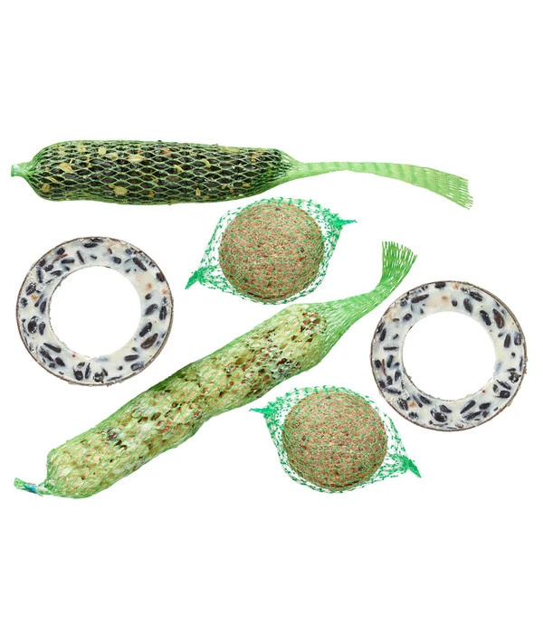 Die Dehner Natura Winter-Futter Spezialitäten enthalten zwei Meisenknödel, zwei Futterringe, eine Futterstange mit Erdnüssen sowie eine mit Sonnenblumenkernen. Alle Vogelfutterspezialitäten sind aus ausgesuchten Getreidesorten, wertvollen Saaten, Nüssen sowie lebenswichtigen Ölen und Fetten hergestellt. Die Meisenknödel sind natürlich die Leib- und Magenspeise vieler Meisenarten, aber auch Kleiber und Spechte picken gerne davon. Auf die Erdnüsse fliegen neben Meisen und Kleiber auch die frechen Sperlinge und es könnte gut sein, dass es lautstarke Zankereien an Ihren Knödeln gibt. Aber auch die Sonnenblumenkerne in Ihrer Dehner Natura Winter-Futter Spezialitäten werden begehrt sein, denn Finken, Spechte, Kleiber, Meisen und Sperlinge lieben die knackigen Kerne.
