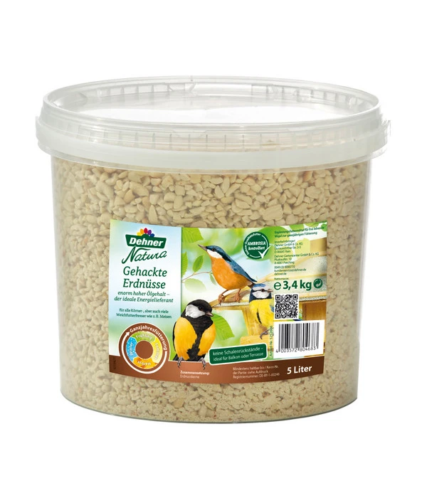 Mit den Dehner Natura gehackten Erdnusskernen leisten Sie einen wichtigen Beitrag zur Ganzjahresfütterung von Wildvögeln. Unsere Dehner Natura gehackten Erdnusskernen sind besonders reich an wichtigen pflanzlichen Ölen, Fetten sowie Proteinen, welche Ihren gefiederten Lieblingen die nötige Energie liefern um gestärkt durch den Tag zu kommen. Vor allem körnerfressende Wildvögel wie beispielsweise Kleiber werden sich an dieser schmackhaften Delikatesse erfreuen. Optimal für die Ganzjahresfütterung Nicht nur in den kalten Wintermonaten benötigen Wildvögel bei der Futtersuche die Hilfe des Menschen. Die Dehner Natura gehackten Erdnusskerne eignen sich optimal für die Fütterung das ganze Jahr über und versorgen Ihre Gartenvögel mit allen wichtigen Nährstoffe. Die Dehner Natura gehackten Erdnusskerne haben einen enorm hohen Ölgehalt, welches es zu einem optimalen Energiespender macht und dafür sorgt, dass Ihre gefiederten Lieblinge genug Kraft für den Tag haben. Zudem sind unsere Dehner Natura gehackten Erdnusskerne ein wichtige Bestandteil zur ganzjährigen Fütterung und besonders bei körnerfressenden Wildvögeln, wie dem Kleiber, besonders beliebt. Aber auch andere Vogelarten, beispielsweise Meisen, erfreuen sich an den schmackhaften Dehner Natura gehackten Erdnusskernen. Da bei unseren Dehner Natura gehackten Erdnusskernen keinerlei Schalenrückstände anfallen eignen sich diese ideal für die Fütterung auf dem Balkon oder der Terrasse.