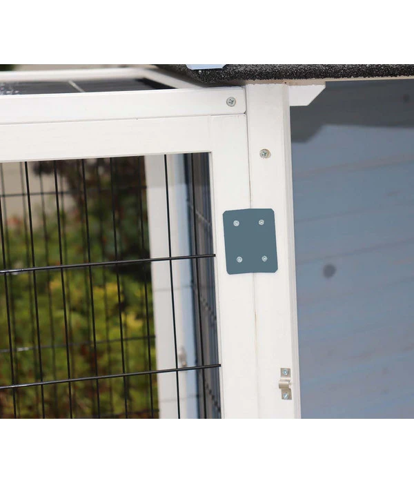 Die Dehner Vogelvoliere Santorini ist eine stabile Konstruktion aus Holz, in die größere und kleinere Gitter integriert wurden. Insgesamt 8 dieser Gitter sind Türen – 6 mit Riegelverschluss, 2 mit Holzklotzverschluss – so dass Sie viele Zugangsmöglichkeiten zur Voliere haben und diese noch leichter reinigen oder umorganisieren können. Das Dach der Voliere besteht aus Bitumen, sodass das Haus – und damit auch Ihre gefiederten Freunde – vor Nässe geschützt sind, wenn die Piepmätze im Sommer mit auf die Terrasse oder in den Garten umziehen und das Konzert der heimischen Singvögel bereichern dürfen. Der Gitterabstand beträgt 15 mm, wie es für Kanaren, Wellensittiche und Co richtig ist.