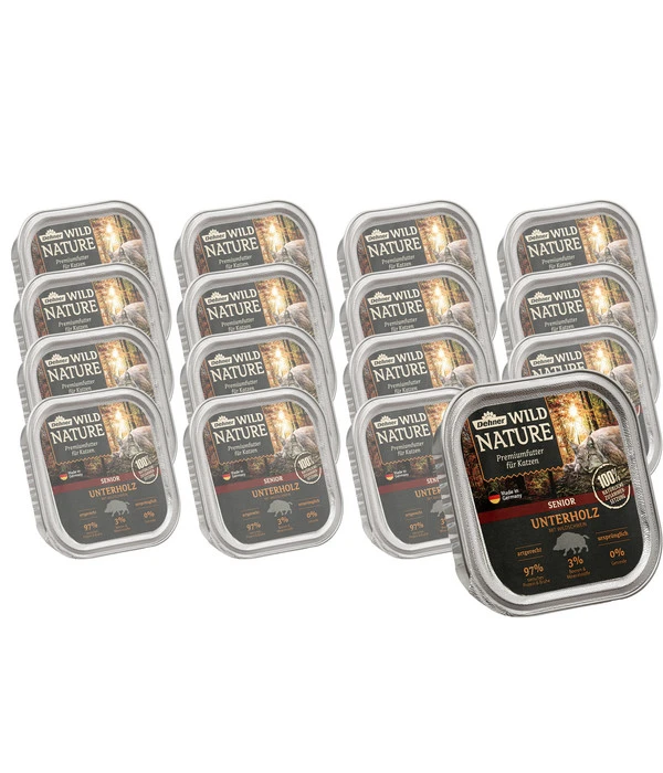 Die Ansprüche an die Nahrung sind bei unseren domestizierten Katzen dieselben wie bei ihren wild lebenden Verwandten wie Luchs und Wildkatze. Deshalb haben wir bei der Konzeption dieses Katzennassfutters die natürliche, ursprüngliche Futterwahl in freier Wildbahn zum Vorbild genommen. Das Ergebnis ist ein Premiumfutter nur aus natürlichen Zutaten, mit einem hohen Fleischanteil und kombiniert mit feinen Beeren. Was das Dehner Wild Nature Nassfutter Unterholz Senior Wildschwein aber besser kann als die Natur, ist die Anpassung der Rezeptur auf die Bedürfnisse alternder Hunde. Denn es ist erwiesen, dass Sie mit einem hochwertigen Futtermittel das Altern Ihrer Samtpfote zwar nicht verhindern, aber die Folgen des Alterns hinauszögern können. Servieren Sie Ihrem Katzensenior deshalb ab sofort das Dehner Wild Nature Nassfutter Unterholz Senior Wildschwein – und erleben Sie noch viele schöne Jahre bei bester Gesundheit miteinander!