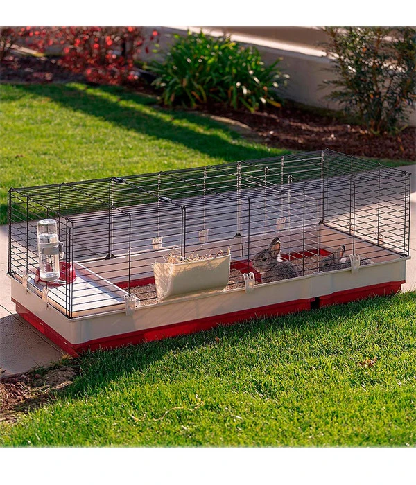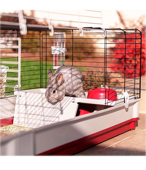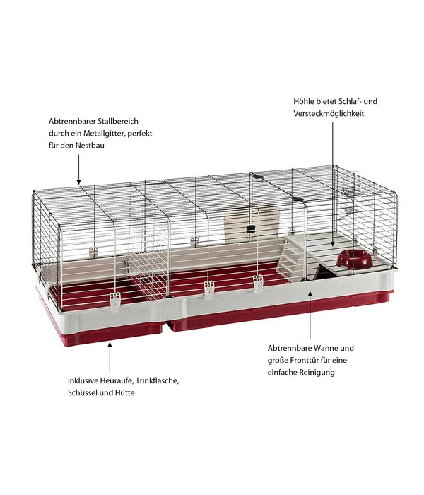 Die praktische Kombination aus Harz-Unterschale und stabilem lackiertem Metallgitter macht das Krolik Nagerheim zu einer idealen Lösung in jeder Situation. Die Konstruktion ist vollständig zerlegbar und beansprucht wenig Platz beim Transport. Es wird Sie sicher freuen zu hören, dass sich auch die Reinigung des Nagerheims sehr einfach und komfortabel gestaltet, denn dank der großen Fronttür sind alle Bereiche des Käfigs hervorragend erreichbar. Ihr ferplast Nagerheim Krolik wird inklusive Heuraufe, Trinkflasche, Schüssel und Hütte geliefert. Greifen Sie jetzt zu!