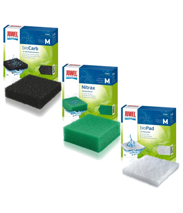 Das JUWEL® AQUARIUM Filterset 1 enthält hochwertige Filtermedien zur schonenden mechanischen und biologischen Reinigung des Aquariumwassers in Ihrem Süß- oder Salzwasserbecken. Der JUWEL® AQUARIUM bioCarb Aktivkohleschwamm dient zur chemischen Reinigung und absorbiert toxische Verbindungen sowie störende Trüb- und Geruchsstoffe. Aktivkohle in Schwammform bietet eine sehr große und wirksame Oberfläche und wird gleichmäßig vom Wasser durchströmt. Mit dem, im Filterset enthaltenen Juwel Nitrax Nitratentferner wird zuverlässig Nitrat aus dem Wasser gefiltert und die Algenbildung im Aquarium reduziert. Für gesunde Fische und schöne Aquariumpflanzen! Die JUWEL® AQUARIUM bioPad Filterwatte in diesem Set nimmt grobe Schmutzpartikel auf und wird als mechanischer Vorfilter in Ihren Aquarium-Filter eingelegt. So schützt sie den Aquarium-Filter und seine Bestandteile vor zu schnellem Schmutzbefall. Kaufen Sie sich dieses JUWEL® AQUARIUM Filterset 1 und sorgen Sie so für klares und sauberes Wasser in Ihrem Aquariumbecken. Sie erhalten insgesamt fünf Filterwatten, ein Paket Aktivkohleschwämme (mit 2 Stück) und einen Nitratenferner, jeweils in der Größe M.