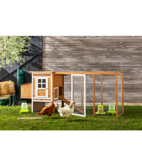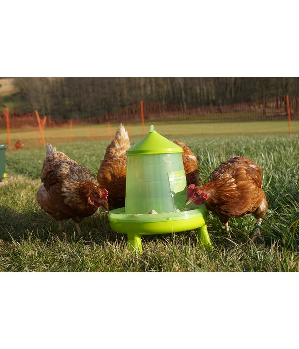 Sie können Ihre Hühner dank der verschiedenen Fressbuchten gleichzeitig in Frieden picken lassen und profitieren davon, dass das eingefüllte Hühnerfutter automatisch nachläuft. Dank der Standfüße des KERBL Hühnerzubehörs bleibt das Futter weitestgehend verschont von Dreck und anderem Unrat. Idealerweise stellen Sie den Futterspender aus lebensmittelechtem Kunststoff relativ zentral auf, so dass alle Tiere diesen gut erreichen können. Ausgestattet mit einer Öse am Deckel lässt sich der Hühnerfutterspender bei Bedarf aufhängen. Anhand des transparenten Behälters haben Sie immer im Blick wieviel Futter sich darin befindet und ob ein Nachfüllen notwendig wird. Entscheiden Sie sich mit dem KERBL Futterautomat mit Standfüßen für ein praktisches Zubehör, das Ihr Geflügel durch stressfreie und saubere Nahrungsaufnahme gesund hält und Ihnen die Arbeit bei der Fütterung immens erleichtert!