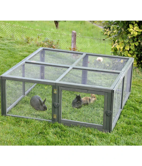 Der stabile, witterungsresistente Holzrahmen des Rohrschneider Freilauf groß ist mit einem robusten Drahtgeflecht versehen. Zugänglich ist das Rohrschneider Freigehege über eine seitliche Tür und natürlich auch – und das ist sehr praktisch – über die von zwei Seiten aufklappbare Abdeckung. Sie schützt Ihre Fellnasen vor ungebeten Gästen, wie zum Beispiel Greifvögeln oder Füchsen, die es ja gern mal auf niedliche Kaninchen oder Meerschweinchen abgesehen haben!