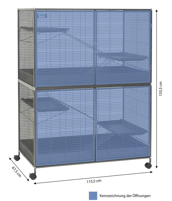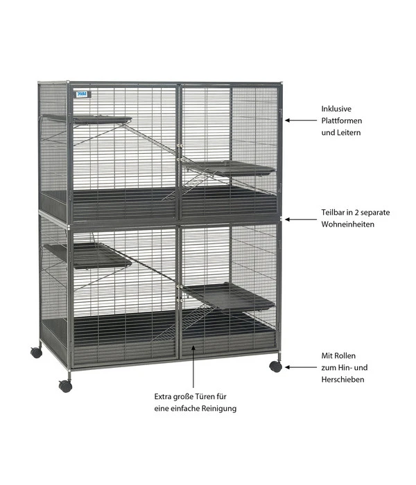 Aus eins mach zwei – bei Bedarf wohlgemerkt! Die SAVIC Nagerheim Suite Royal XL ist das perfekte Zuhause für Kleintiere, wie etwa Ratten Chinchillas oder Degus. Sie können die Suite als ein großes Nagerheim nutzen oder mit wenigen Handgriffen zwei Kleintier-Käfige daraus machen.