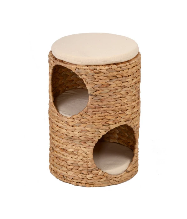 Die Silvio Design Katzentonne Wasserhyazinthe mit den beiden übereinanderliegenden Höhlen und die gemütliche Liegefläche oben, machen sie zur einer perfekten Katzenhöhle für Ihren Liebling. Die beiden Kuschelhöhlen sind jeweils mit einem wollweißen Kissen ausgestattet und bieten den idealen Rückzugsort für Ihre Katze zum Schlafen. Einen tollen Aussichtsposten kann Ihr Schmusetiger oben auf dem weichen Kissen der Katzentonne von Silvio Design beziehen oder dort ebenso entspannt relaxen. Die Katzenhöhle mit dem Wasserhyazinthengeflecht wirkt natürlich, ist handgeflochten und der eingearbeitete Metallrahmen sorgt für Stabilität. Sie können diese sogar als Sitzhocker nutzen – das perfekte Katzenmöbel, welches sich harmonisch und praktisch in Ihr Wohnambiente integriert.