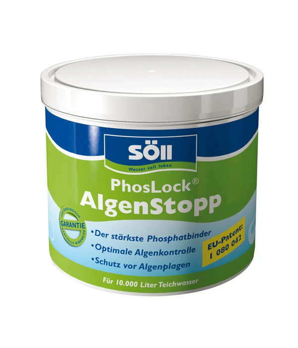 Damit Ihre Fische ein langes, vitales Leben haben und nicht von lästigen Algen geplagt werden gibt es Söll PhosLock Algenstopp. Wenn Ihr Gartenteich zu viel Phosphat aufweist bieten Sie Algen einen optimalen Lebensraum. Mit dem Söll PhosLock Algenstopp können Sie das Phosphat bis unter 0,035 mg/l senken. Genau das unterscheidet Söll PhosLock Algenstopp von herkömmlichen Phosphatbindern. Der Grundnährstoff von Algen ist gelöstes Phosphat und genau dieser muss optimal gebunden werden, sodass Sie einen massenhaften Algenwuchs effektiv vorbeugen können. Söll PhosLock Algenstopp ist der stärkste Phosphatbinder der Welt und unterdrückt zudem auch die Nährstoffrücklösung aus dem Teichschlamm. Wenn Ihr Gartenteich schon eine Algenblüte hat, was sich durch trübendes grünes Wasser bemerkbar macht, empfehlen wir parallel zu Söll PhosLock Algenstopp die Algenbekämpfung mit Söll AlgoSol.