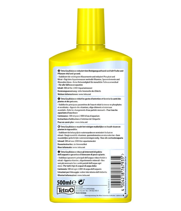 Vor Anwendung gut schütteln. Wöchentlich 2,5 ml Tetra EasyBalance pro 10 l Aquarienwasser zugeben. Das helle nitratreduzierende Granulat ist im Produkt sichtbar und sinkt zu Boden. Es ist unschädlich für Fische, selbst bei Verzehr. Es ist wichtig, Tetra EasyBalance wöchentlich anzuwenden, um den Zeitraum bis zum nächsten Wasserwechsel zu verlängern. Für alle Süßwasseraquarien.